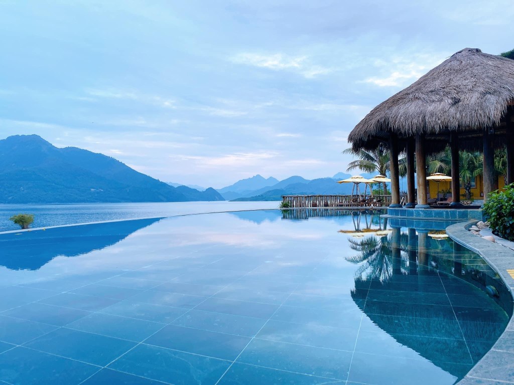Quay lại tiếp với em Mai Châu, sau một chặng đường bò lắc lư trên con đường quanh co hình cùi chỏ liên tục đâu tầm 30 phút, nhịp tim cũng bắt đầu hơi biểu tình thì em ấy bất thình lình hiện ra rực rỡ. Em có tên là Mai Chau Hideway Resort, một căn resort nhỏ xinh xinh nằm lọt thỏm trong lòng hồ thủy điện Hòa Bình thơ mộng, xung quanh được bao bọc bởi đồi núi trập trùng xanh mướt mát. Ngày chúng tôi đến đây, trời ưu đãi nên ban cả khu resort cho mỗi hai đứa. Mai Châu bình thường đã vắng, chúng tôi đi ngay ngày giữa tuần nên chẳng có ai, thế là tung tăng khắp chốn hưởng thụ sự bình yên tĩnh lặng hiếm có. Mà nhiều khi cũng chẳng cần đi đâu xa, chỉ ở ngay trong phòng kéo rèm cửa trắng ra là cả thiên đường đã hiện ra trước mắt…xanh ngút ngàn của nước, của trời mây, đưa tay mở một bản nhạc yêu thích cùng ly cafe nóng là thấy lòng mình dịu dàng đi nhiều bao nhiêu…
